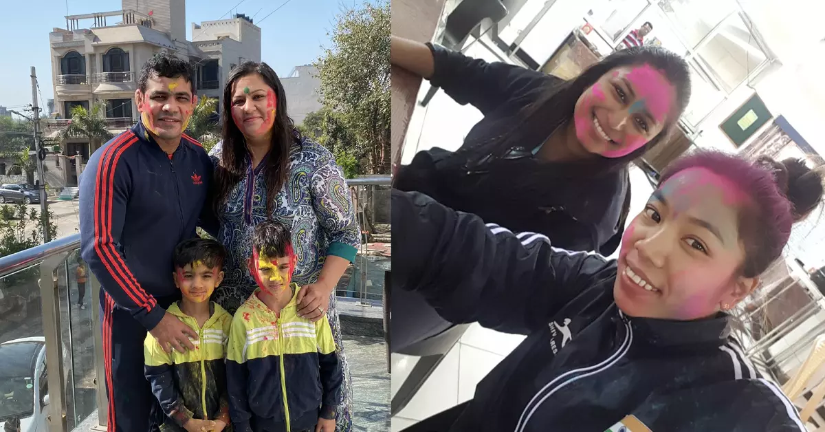 Apart from Sushil, another wrestler and bronze medalist in World championship, Bajrang Punia also played Holi with family and friends and his then, fiance Sangita Phogat.