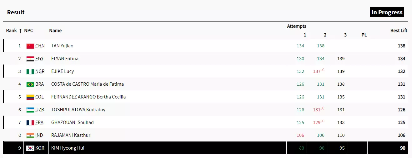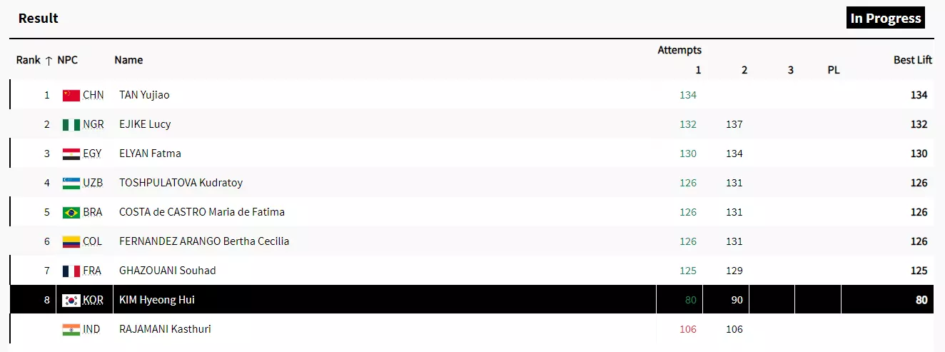 Kasthuri successfully lifts 106kg in her second attempt and is currently in 8th place, just behind Korea's Hyeong Kim, whose best lift is 90kg.