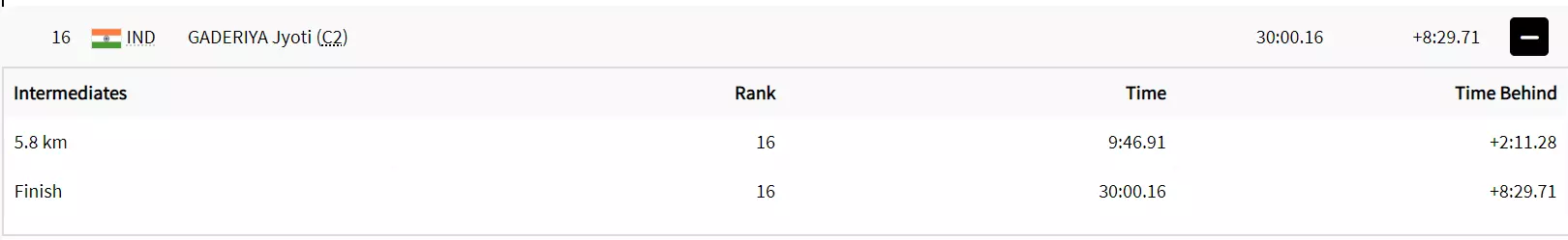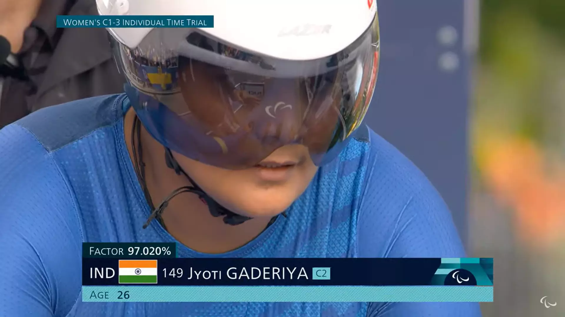 Jyoti Gaderiya finished in last place with a time of 30:00.16, 8:29.71 behind the gold medalist, Maike Hausberger of Germany, who completed the time trial with a time of 21:30.45.
