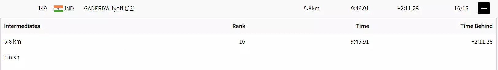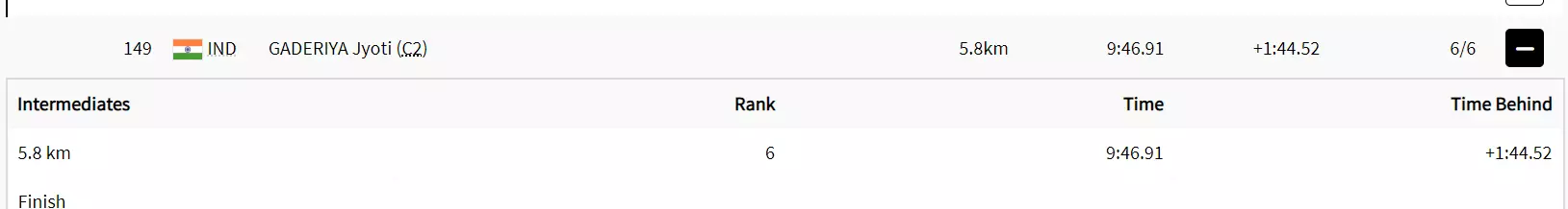 Jyoti Gaderiya has finished the intermediate crossing with a time of 9:46.91 and is currently ranked 6th.
