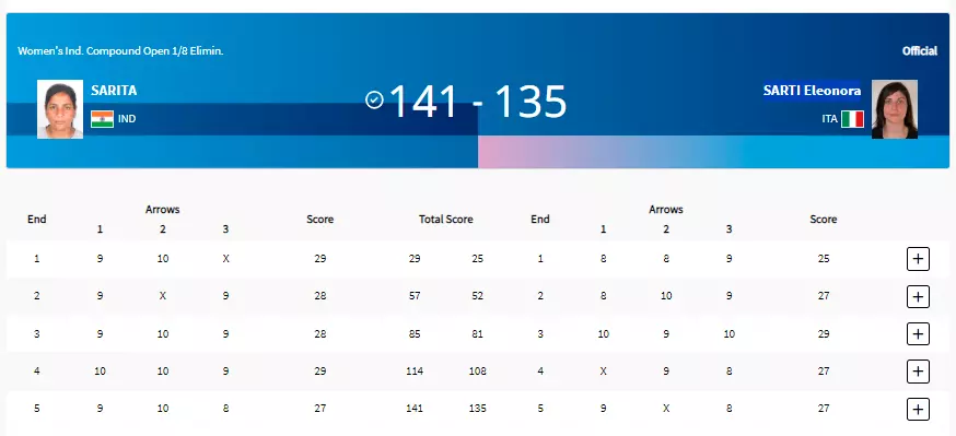 With this win Sarita has become the first Indian to qualify for the quarterfinals in the history of Para-Archery at the Paralympic Games.