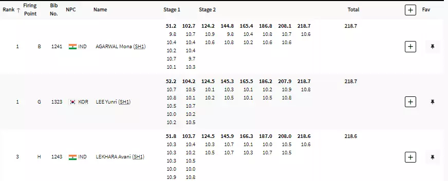 After 20 shots, Lee is at 207.9 points. Avani at 208 points and Mona at 208.1 points.