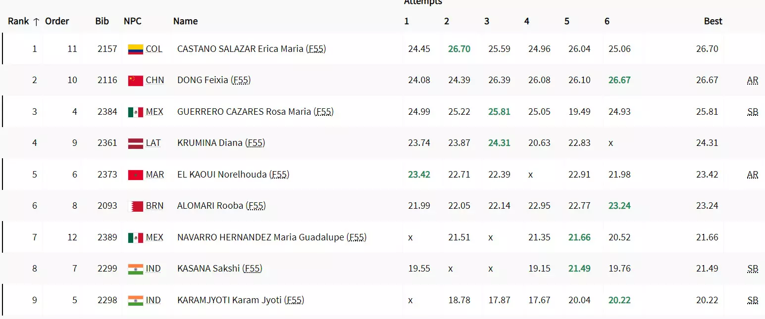 India's Sakshi Kasana (21.49m) and Karamjyoti (20.22m) finished in 8th and 9th position respectively despite hitting their season-best throws in the Women's Discus Throw F55 final.