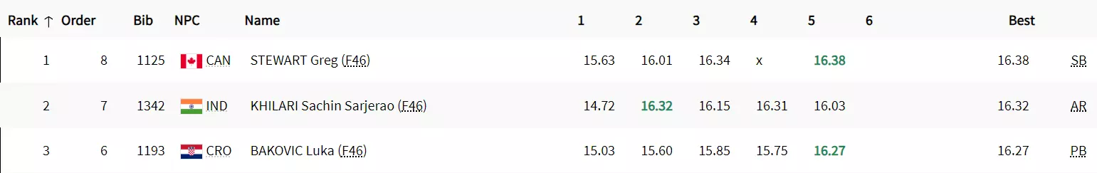 Men's Shot Put F46 Finals: These are the top-six shot putters at the halfway mark.
