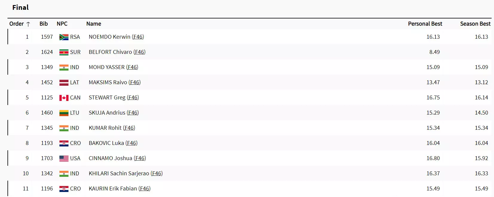 Yaseer, Rohit Kumar and Sachin Khilari will represented India in the Men's Shot Put F46 event.