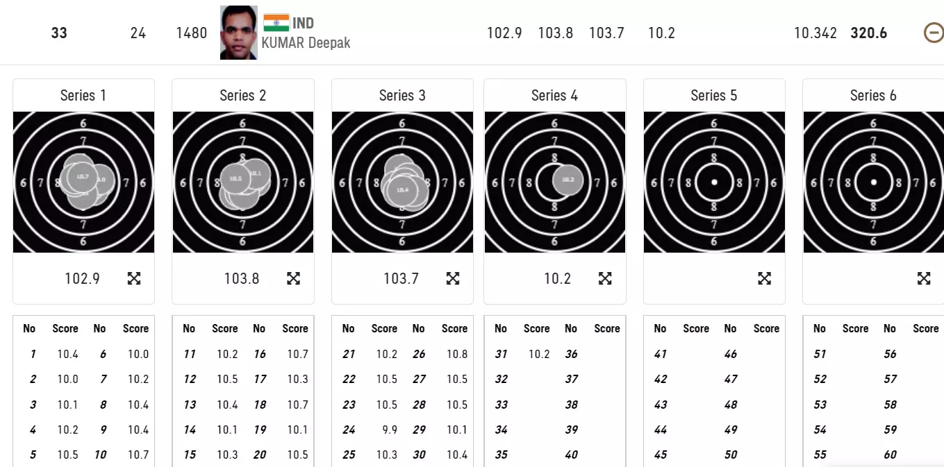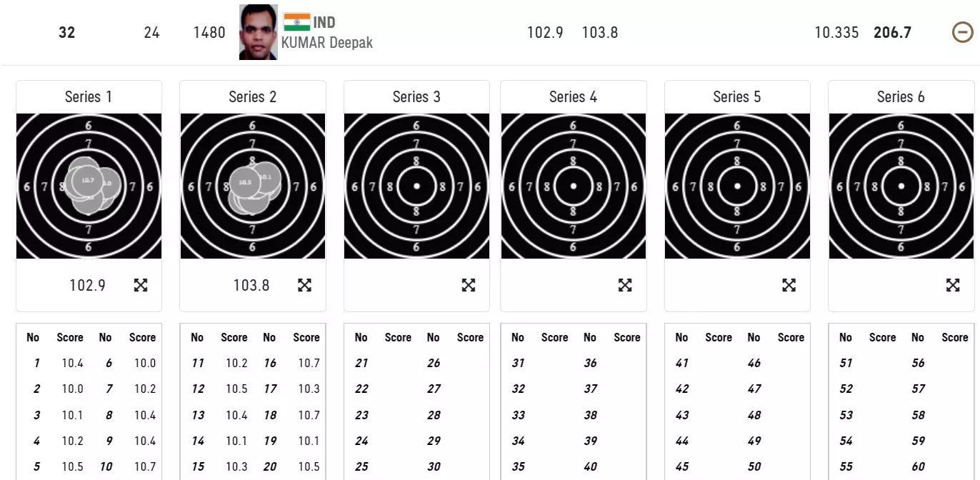 Deepak Kumar shoots 103.8 in the second series, but there is a lot of catch up to do. He is ranked 32nd currently.