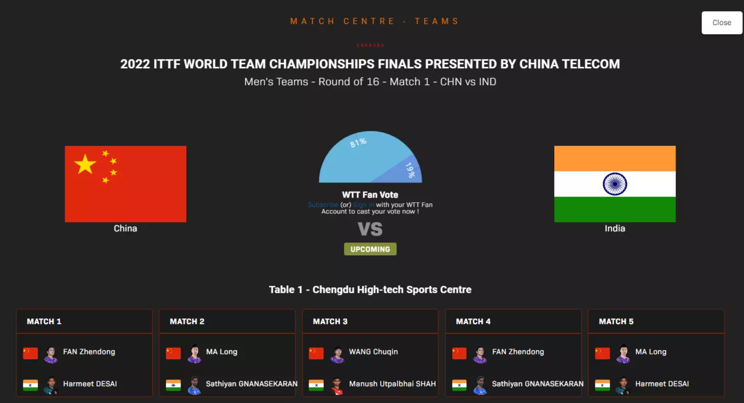 Follow all the highlights from India's loss against China in World TT Teams Championships.