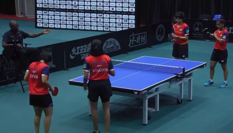 Sreeja-Archana takes the first game as Yashaswini's block return landed outside the table