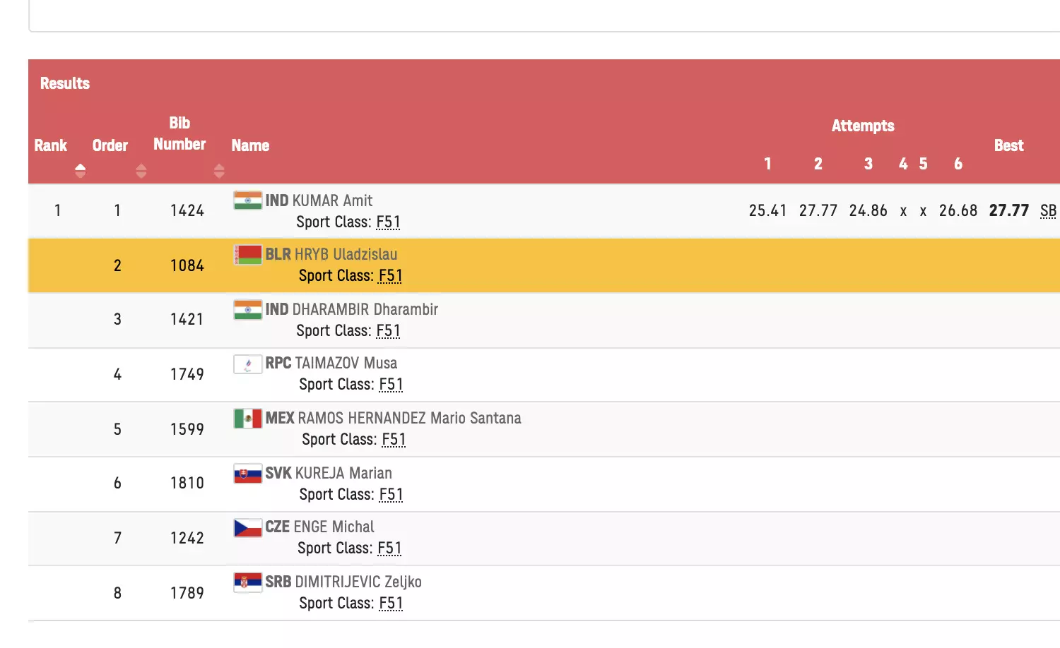 He ends with a throw of 26.68 and ends his round with a best throw of 27.77m.