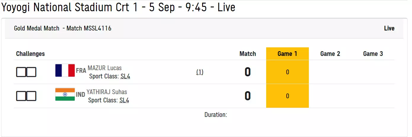 Both Suhas Yathiraj and the Frenchman Mazur Lucas are out on Court 1 for the Gold Medal match. Remember, the Indian had lost to Mazur in their group league encounter.