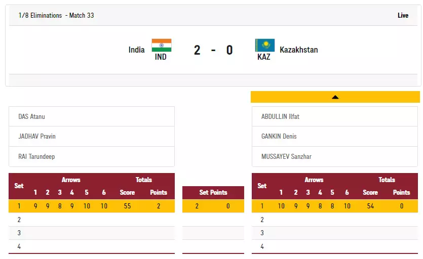 Dismal shooting as India score a 8 and a 7. Atanu however comes to the rescue and scores a 9 to win the set by 52-51.