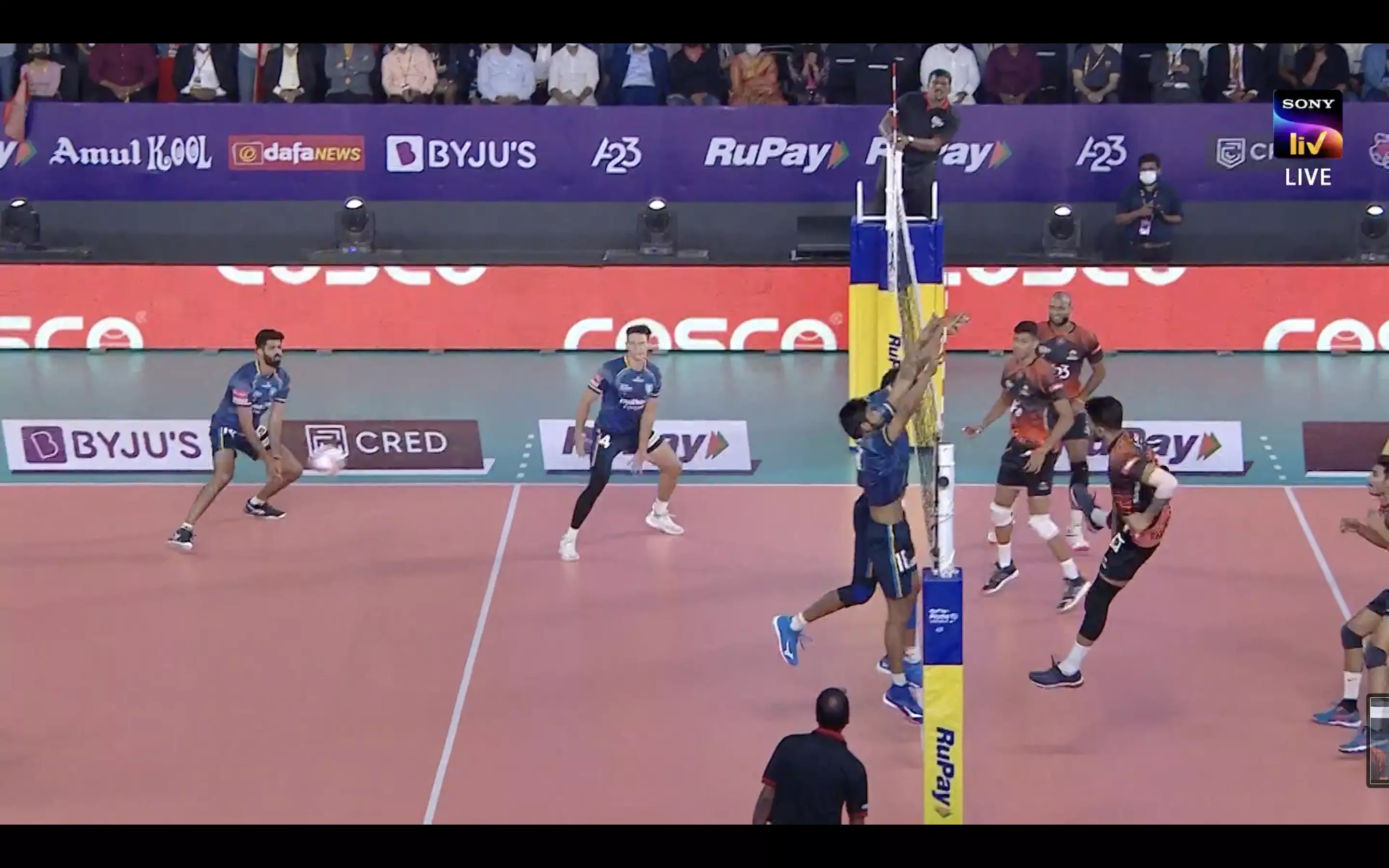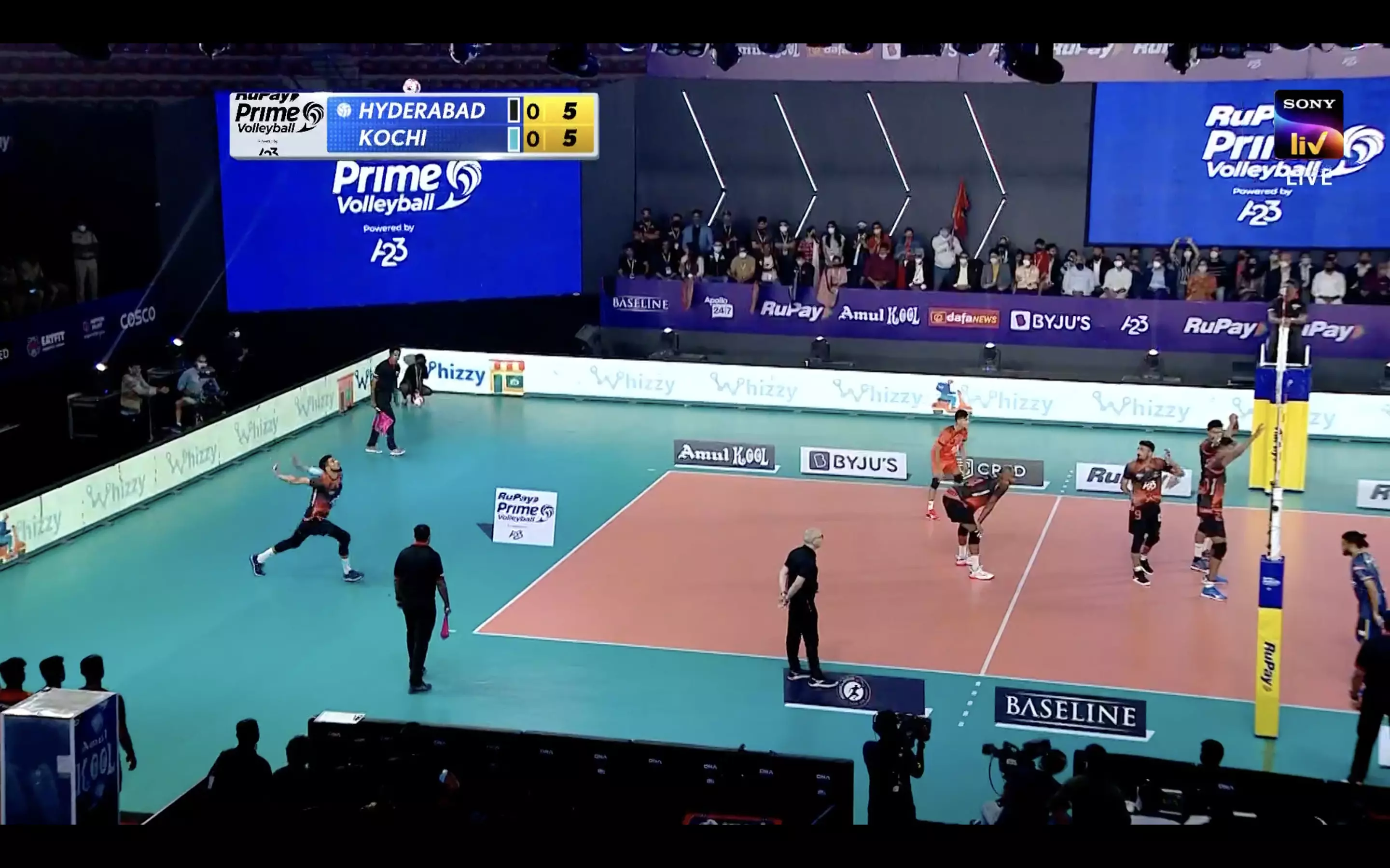The home team are racing away with the win it seems. They have bagged the second set as well with a powerful spike. They are up 15-12, 15-11. Kochi have their task cut out!