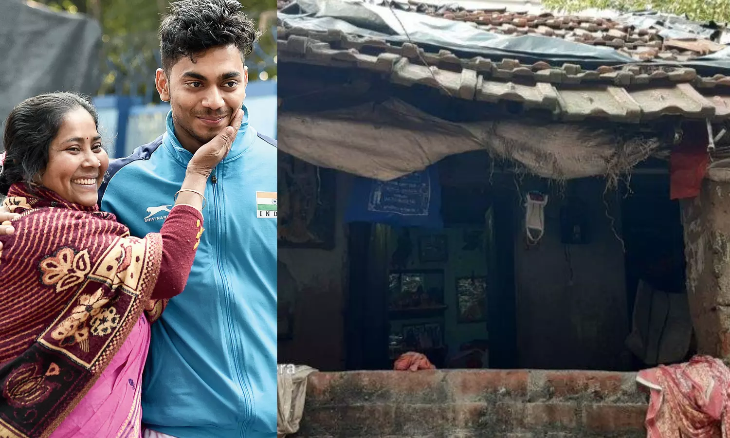 (L) Achanta Sheuli with his mother Purnima who took up odd jobs as a tailor to put food on the table. (R) his house.