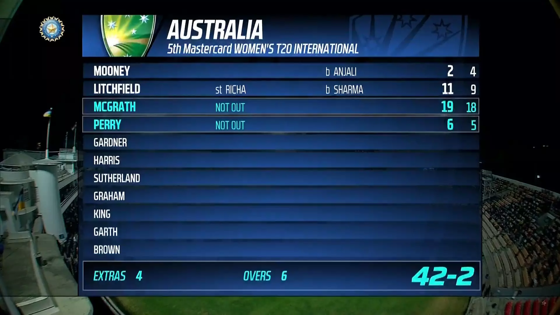 Tahila McGrath took some time to settle down but she has belted Deepti Sharma for 16 runs in the final over of powerplay including 2 sixes and one four.