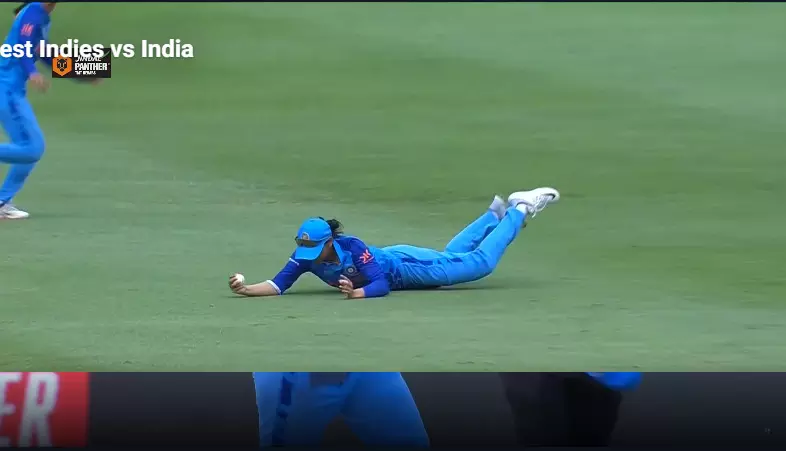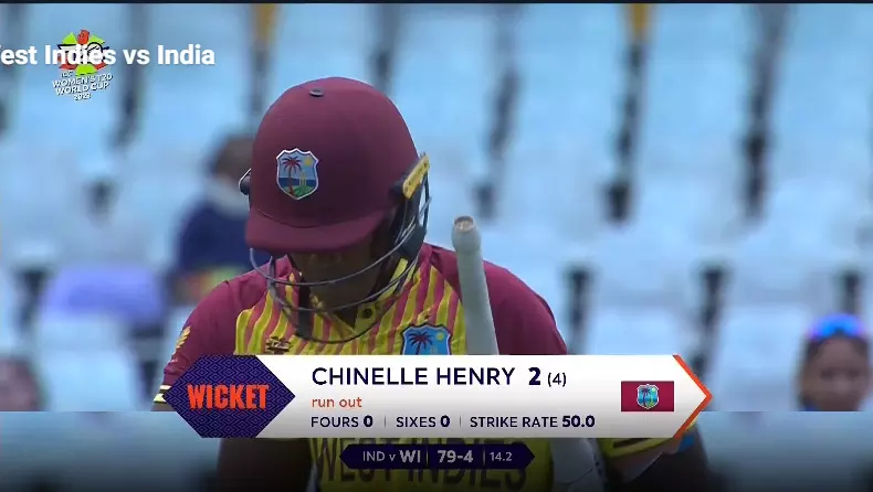 A lapse in running and Mandhana affects a run-out. Henry walks back disappointed.