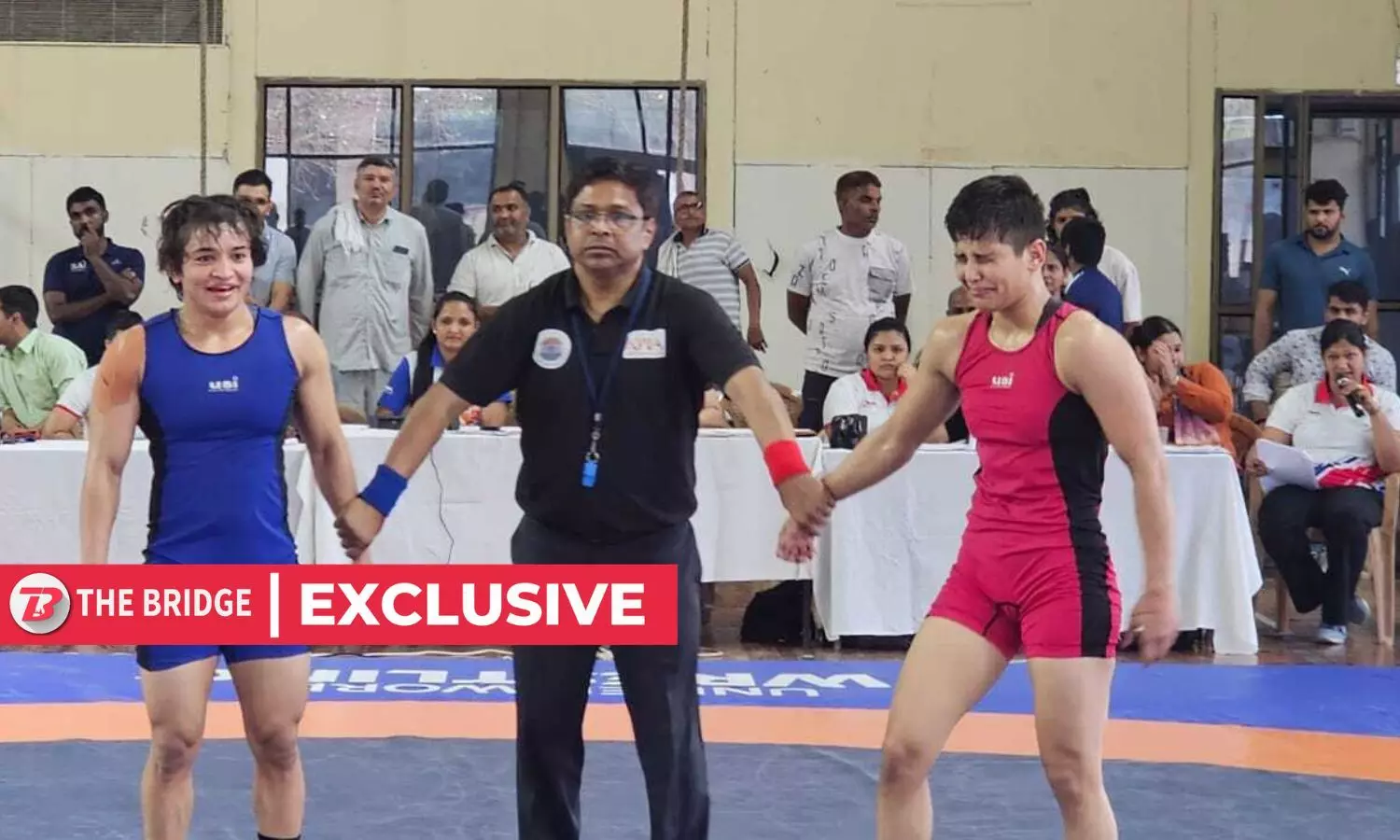 Meenakshi (blue) beat Antim Panghal in the 2026 Asian Wrestling C'ships trials (Photo credit: Ritu Sejwal/The Bridge)