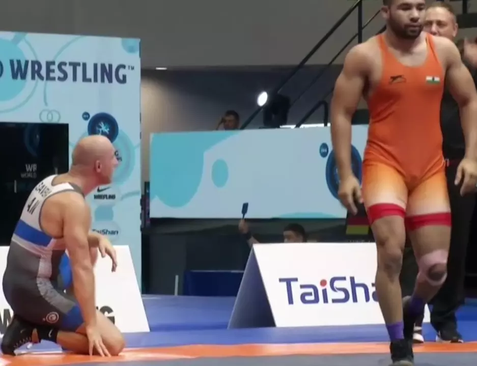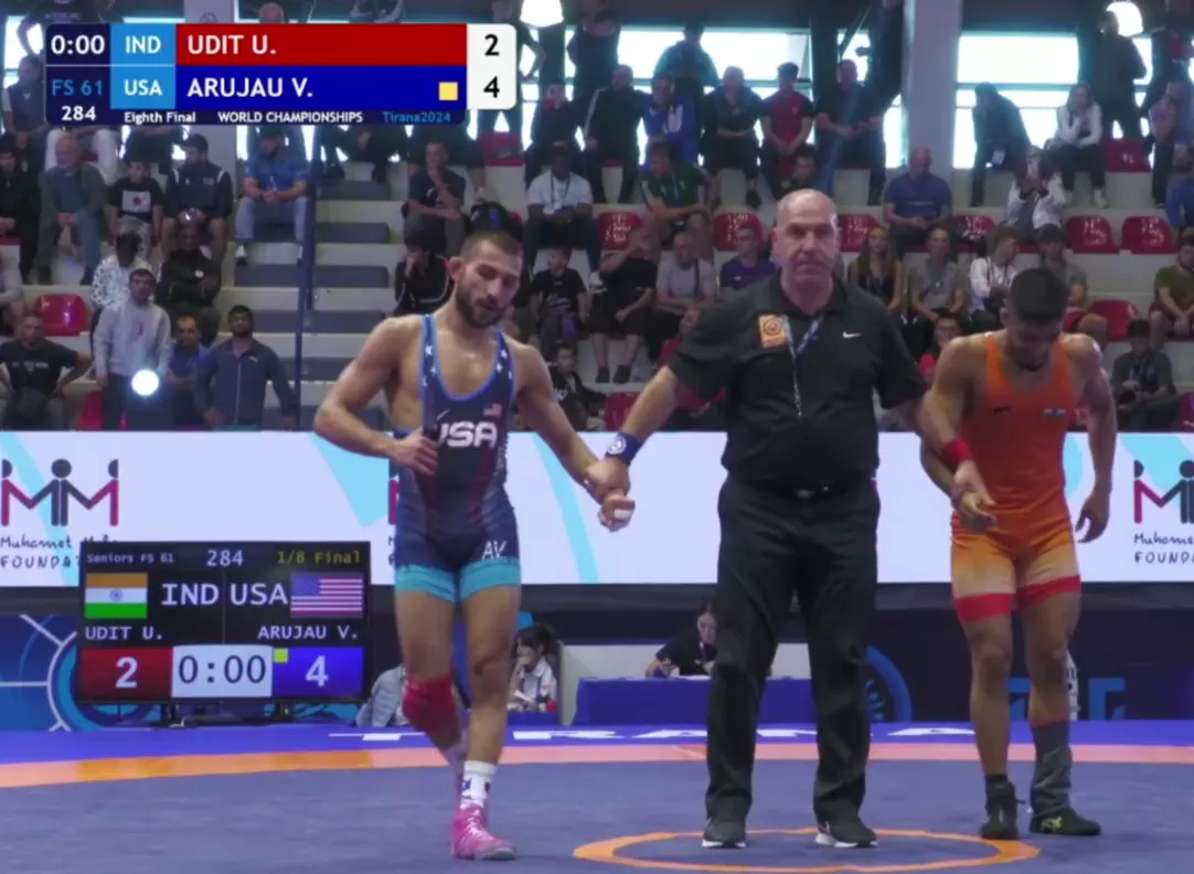 Udit in action at the elimination round of World Wrestling Championships 2024.